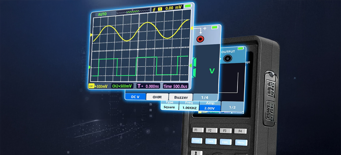 Hantek 2D82 to wielofunkcyjne urządzenie zaprojektowane specjalnie do użytku motoryzacyjnego. Łączy w sobie oscyloskop, generator przebiegów i multimetr, a także zawiera specjalistyczne funkcje diagnostyczne. Ten przenośny oscyloskop działa na zasilaniu bateryjnym i można go ładować za pomocą kabla USB typu C (dołączonego do zestawu).